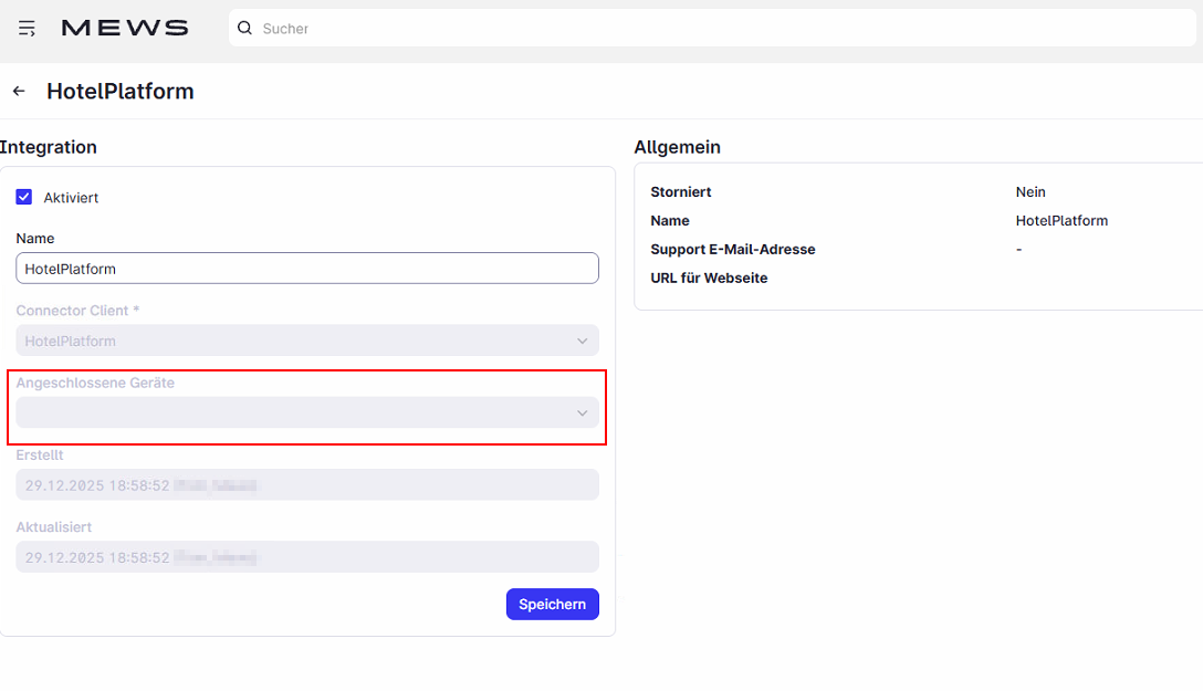 Im Marketplace die "HotelPlatform" Integration auswählen. Unter "angeschlossene Geräte" den / die entsprechenden Kodierer hinterlegen.